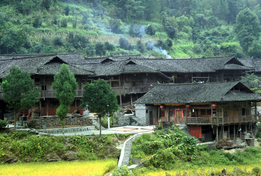 現(xiàn)有民居 20 余棟,10 余戶,100 余人,主要姓氏為李姓、談姓,主體民族為苗族。談家院子由李家院落和談家院落組成,是一個高坡苗寨。有李、談、張、黃、彭等姓。整個院子以撮箕口全木質(zhì)吊腳樓建筑為主,樓上人住,吊腳樓下多為牲畜圈舍。談家的祖屋原為 3 間正房兩邊轉(zhuǎn)角廂房吊腳樓,中堂外有 4 朵雕花窗,分別為“年年有余”、“喜鵲鬧梅”“百鳥朝鳳”“野鹿銜花”圖案。舊時談家有母系氏族遺風(fēng),是李姓祖婆當(dāng)家,4代同堂,十分興旺。現(xiàn)存房子多為近代新建,老宅只有 4 朵雕花窗戶尚存。