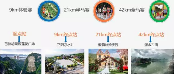 本次比賽分為42公里個人賽、21公里個人賽、9公里群眾健身賽三大競賽項目,起點均為芭拉胡景區(qū),9公里群眾健身賽的終點設(shè)在涼水井廣場,21公里個人賽的終點設(shè)在愛莉絲莊園,42公里個人賽終點則設(shè)在濯水古鎮(zhèn)紅軍渡廣場。