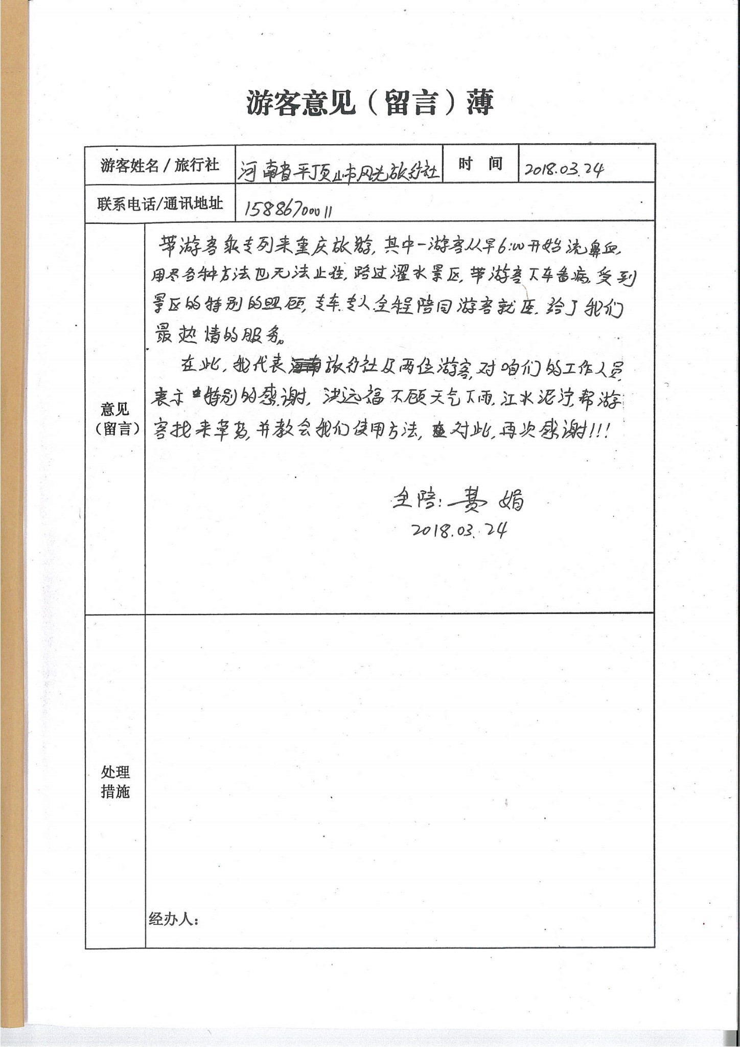 事情起源于2018年3月24日,來自河南平頂山風光旅行社的旅行團,有一名游客流鼻血不止,嘗試了多種辦法,均沒有效,路過濯水景區,導游帶生病的游客看病,受到濯水景區醫護人員和工作人員的熱心照顧,很快止住病情。特此,旅行團的導游和游客寫下了真情滿滿的感謝信,感謝濯水景區的熱心服務,對這種暖心服務點贊和鼓勵。