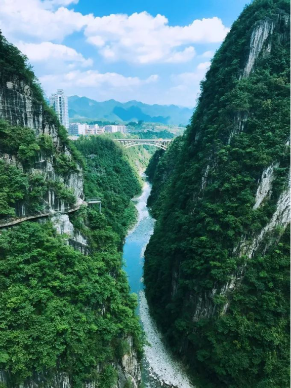 黔江 “芭拉胡”自然融合度高,氣勢宏大。登高遠望,恰似一條綠色絲絳,將老城 新城 逢合在一起,繪就一幅名副其實的“城即景、景即城”的水墨丹青。谷寬80-100米,平均深度200米,最大落差500米;