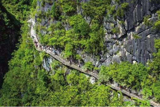 芭拉胡峽谷地質發育完整,登高遠望恰似一條地縫,谷寬 80-100 米,平均深度 200 米,最高落差 500 米;峽谷峭壁直立,崖壁大多與地平線成直角,走上808米長的空中棧道,尤其是懸掛在500米高空的100米透明玻璃棧道,大有“讓你飛”的感覺,令人心跳;兩側峰巒起伏,鬼斧神工,呈現出中國西南地區典型的喀斯特地貌,40 多個奇特的礫巖溶洞品質上乘,洞內常年恒溫18℃。黔江,其實就是一座罕見的溶洞撐起的城市。