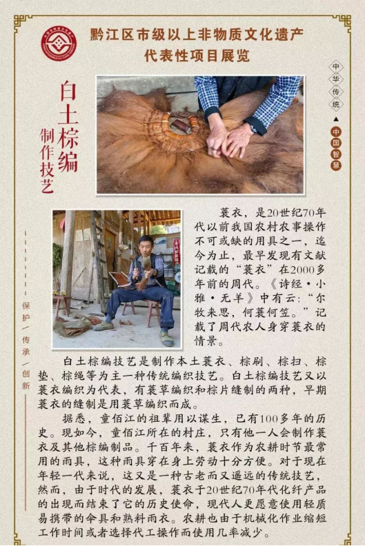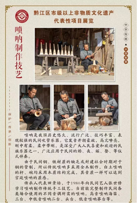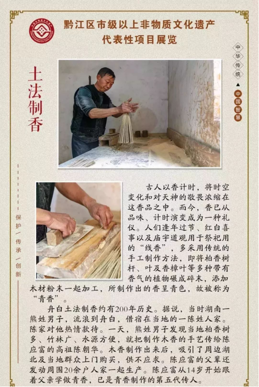 黔江區報送的《白土棕編》《白土嗩吶制作技藝》《土法制香》《黔江區王氏牛皮鼓制作技藝》《王氏灶臺建造技藝》《黔江傳統竹編》《官村麻糖制作技藝》《陸氏中藥酒曲傳統制作技藝》《土家婚俗》《土苗喪葬禮儀》十個項目成功獲批。
