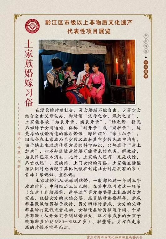 另外,黔江區還把非物質文化遺產與旅游打造相結合。2004年以來,黔江區先后成功申報中國武陵山民族文化節、武陵山國際民俗文化旅游節,建成了土家十三寨民俗生態博物館,承辦了首屆、第二屆和第四屆中國武陵山民族文化節,使之成為了武陵山區重要文化品牌和民族文化、“非遺”傳承的重要平臺。