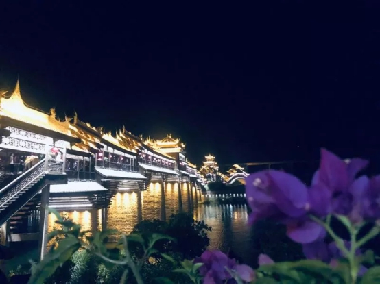 篝火晚會后,夜游風雨廊橋,在廊橋的另一頭可以看到其全景,走進廊橋后,頗有“只緣身在此山中”的悵然,但站在橋上看濯水河又是另一番景象,河風給燥熱的空氣增添了一絲涼爽。