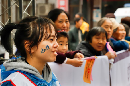 《美女主播》11月24日上午,在山馬賽正陽(yáng)終點(diǎn)站,一美女主播現(xiàn)場(chǎng)拍攝解說(shuō) 李詩(shī)素