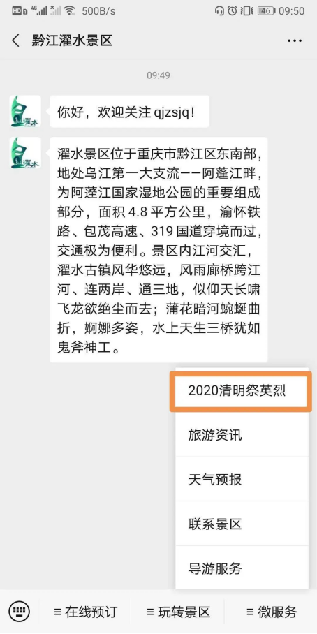 2.關(guān)注“黔江濯水景區(qū)”微信公眾號(hào),點(diǎn)擊底端菜單欄“微服務(wù)”——“2020清明祭英烈”活動(dòng)入口: