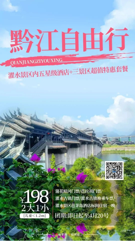 黔江自由行優惠來啦,198元一家三口即可快樂出游,江景房、金牌景點全含,識別圖中二維碼即可購買!