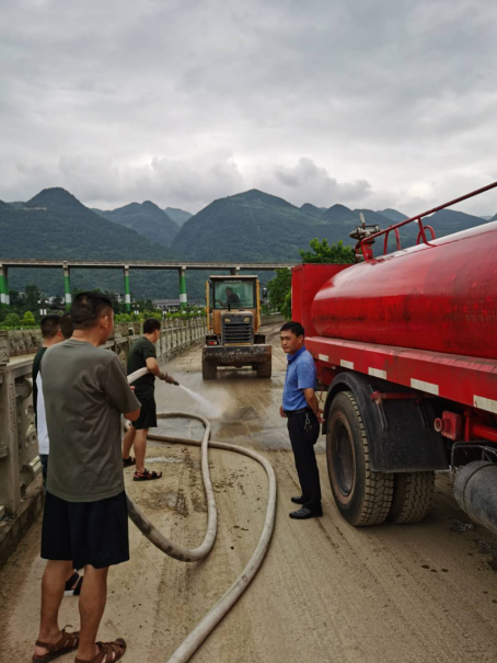 濯水景區協同資安部工作人員對洪峰后主游景觀大道路面進行沖洗現場淤泥清理