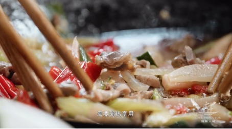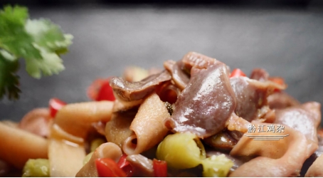 放入泡椒、酸蘿卜酸辣鮮爽調和雞雜,爆炒中風味綻放成就小而美的黔江雞雜。雞胗本就獨具魅力天生袖珍與緊實,又在黔江人的巧手中俘獲千萬人的胃!