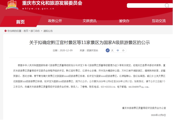 12月8日從重慶市旅游景區質量評定委員會獲悉,根據中華人民共和國國家標準《旅游景區質量等級的劃分與評定》和《旅游景區質量等級管理辦法》等有關規定,經相關區縣景評委初評推薦,重慶市旅游景區質量等級評定委員會按程序組織評定,黔江官村景區達到國家AAAA級旅游景區標準,擬評定為國家AAAA級旅游景區;現予以公示。公示期為2020年12月9日至2020年12月17日。如有異議,請于公示之日起7個工作日內,向重慶市旅游景區質量等級評定委員會反映。